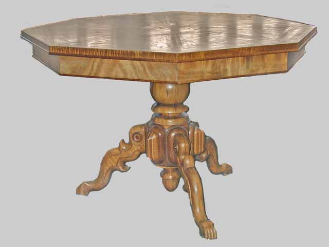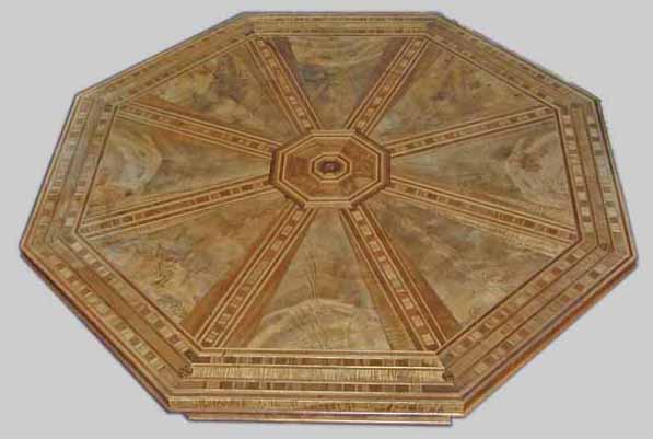 Octagonal Hawaiian woods inlaid table attributed to William Menzel Measuring approximately: 30” high x 44 ½” diameter Areas of concern: Many of the inlays of the top have shrunken and are loose from secondary wood with one piece separated/removable.