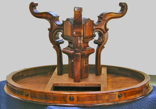 Treatment: Remove top from column/base assembly, remove legs from column. Clean mating surfaces and rejoin legs to column with hot hide glue. Clean table surface with hexanes and water/surfactants on paper toweling to remove wax and other contaminants and paint residues. Fill major losses to bead section of one foot (isolated by a layer of Acryloid B-72®) with an epoxy-bound pigment tinted silica and phenolic microballoon mixture; trim to profile. Inpaint with light-stable dyes as necessary and seal with orange shellac. French polish over other abrasions on base. Lightly French polish top. Paste wax and polish all. Treatment Objective: Lessen unsightly appearance on moldings and overall; seal exposed wood surfaces to prevent further losses and repair loose joinery to prevent failure/breakage. |