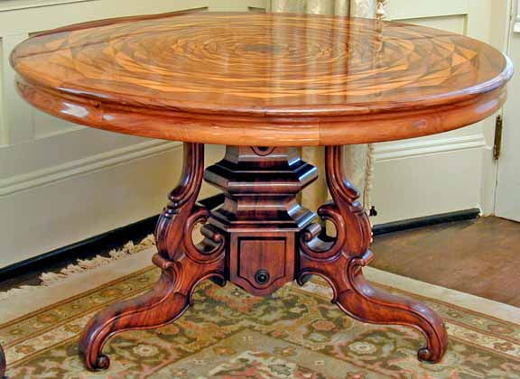 TOP: Top finished with what appeared to be a thick layer of blonde shellac or other resin which had delaminated over much of the central area of inlays and along many of the glue lines. Some areas of loss to the finish had occurred as well as staining into the woods around losses. Several pieces of the inlaid woods were completely loose and could be lifted out from the table surface. Presence of staining, delamination of finish as well as the lack of adhesive residue traces on mating surfaces of the inlays would indicate repeated and/or prolonged exposure to water. A faint pattern of what is commonly referred to as "orange peel" could be seen over the entire top. This would strongly indicate that the existing finish was applied by spraying. The top may have been polished or compound buffed to lessen the orange peel defect. There were brush or rag marks in the finish on the skirt, indicating that finish on this area was applied by hand. It was apparent that the entire piece had been heavily “polished” with silicone containing waxes which considerably complicated finish work.