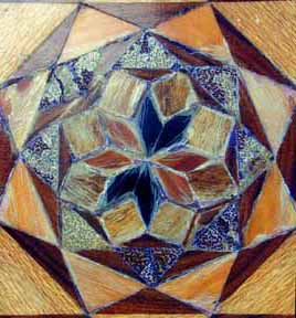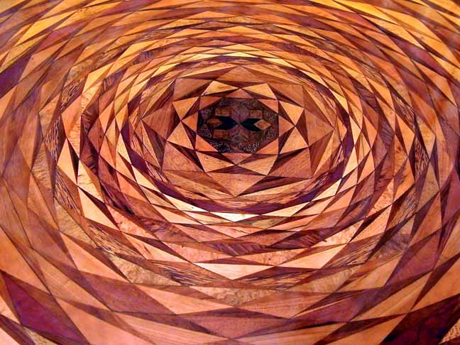 Wood is koa (leg, column and skirt) with a 496-piece inlaid top made of 12 different native Hawai'ian woods. Secondary wood of top underside is Douglas fir and another unidentified wood. Condition: