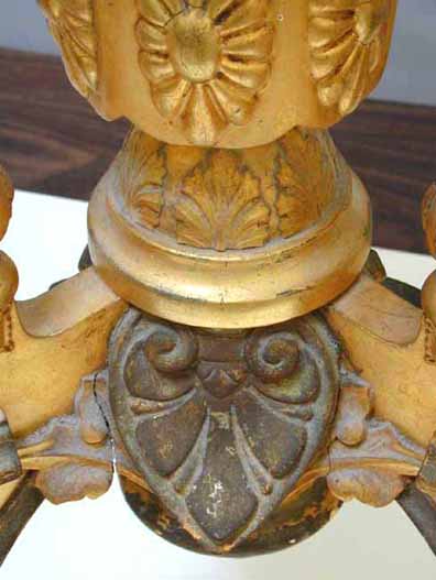 1) Two of the hanging finials were broken off, one of which was apart/across at top of torus; top of the third loose but attached. Two of the lower finials were detached; one of which had been broken off at the mounting dowel.