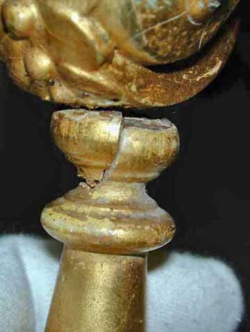 Some losses to the wood/gesso/gilding had occurred around these breaks, and evidence of old repairs was evident. Some joints were slightly loose and cracks in the gessoed/gilt layers were visible. Drying/shrinkage cracks were present on several of the compo applied moldings.