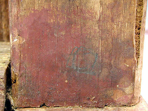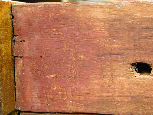 Seat planks, as are described below, were painted with a red paint as well, but appears to be a different, duller color. The bracing boards that the seat planks rest upon, have been painted with an ocher colored paint.