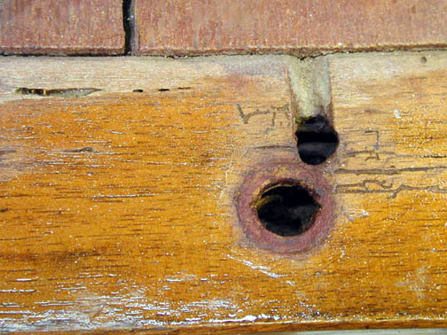 Due to the degree of termite channeling, the cord holes were filled with this mixture as well; as were many of the spindle sockets. Missing portions of many of the spindle tenons were built up with this same mixture and then reshaped to the correct profile.
