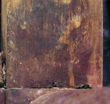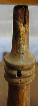 A "wood dough" type of filler had been marginally applied into some of the exposed channeled areas. The top rail appears to be a replacement, as no termite channeling extends into it through the spindle sockets, and this underside was relatively clean, unfinished and unstained. Many of the spindles were splitting and most had been hand pared at the tops in order to fit them into the top rail.