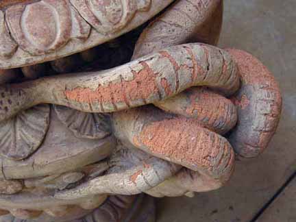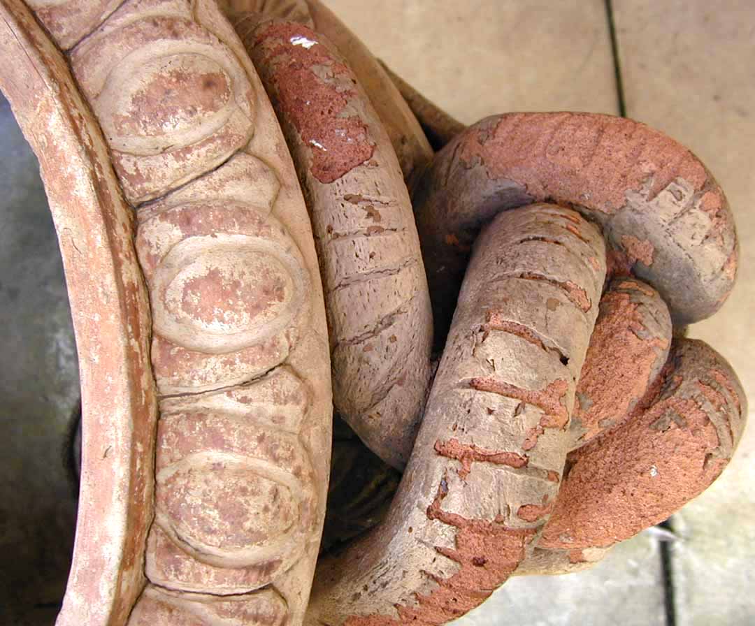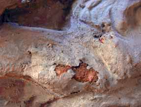 Some areas on mostly upper surfaces are severely eroded. This surface erosion of the clay body extends down from the original (clay) surface several millimeters and in some areas deeper. Raised elements in the eroded areas have much of their edge profiles missing (fig. 5).