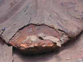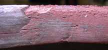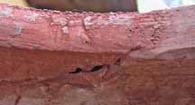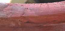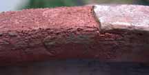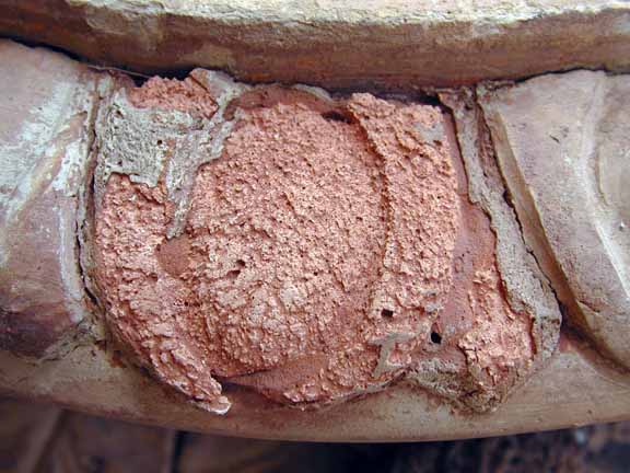 As previously stated, the erosion is quite limited to areas directly under or adjacent to, the thick applied coatings (fig. 2 - 8). Exfoliation of this coating is occurring as well as the erosion of the clay body beneath it. Where the coating becomes thinner or where only brush marks are visible, little if any erosion is visible.