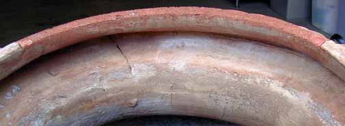 Upper lip/rim section has been repaired with clay and blended (fig. 9-11) into undamaged areas; a blind crack extends down 15-20cm. below the repaired rim. (fig. 1 & 9) This crack appears to be stable (not continuing to travel), however, vibrations and expansion/contraction cycling may cause this to change There are numerous lesser cracks overall which will not be further addressed here.