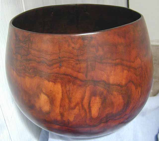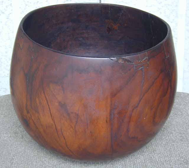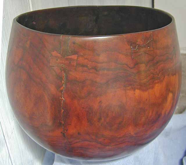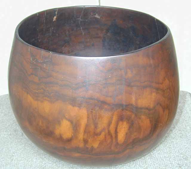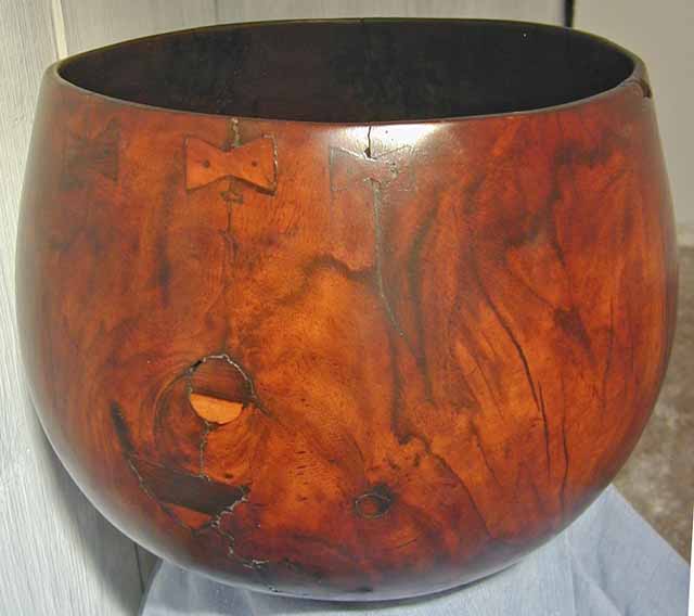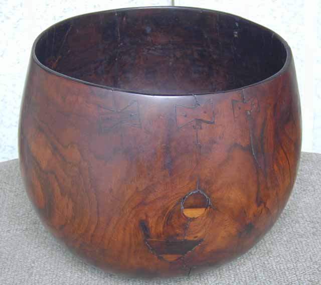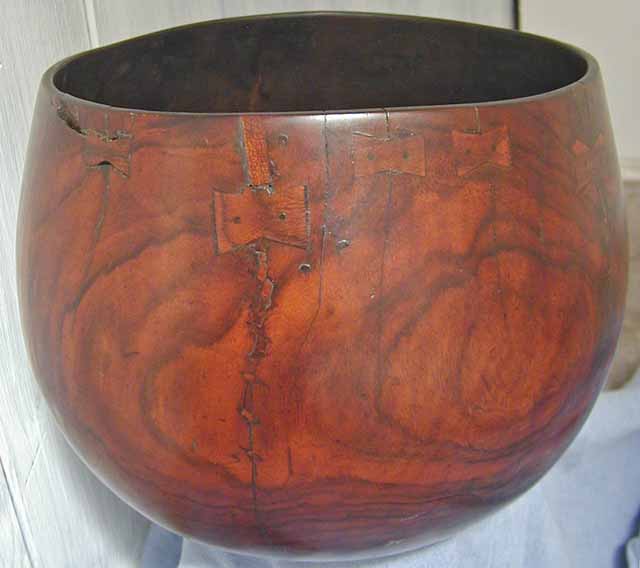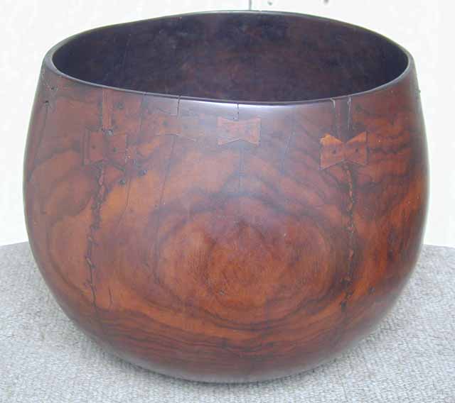Description: Hand carved, early kou wood umeke, measuring approximately 8 ¼” H x 10 ¼” W. Numerous wooden butterfly and small lozenge inserts cover major cracks on bowl sides. One round and a triangular patch are above each other at/below the middle of the bowl; a square patch is in the bottom center. Losses exist along many of the old cracks with a major[i] deep and wide loss along the outside rim. A steel brad head protrudes from one of the butterfly patches. Several of the cracks that come to the rim are slightly loose and flex. Many of the losses have been filled with what appears to be shellac[ii]. Bowl appears to have been finished with shellac, outside and in, with a “non drying” oil [iii]applied over the older shellac finish. Overall, dirty/dull in appearance.